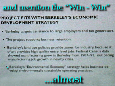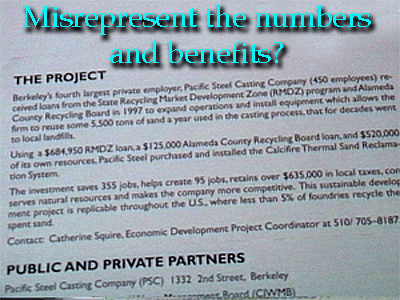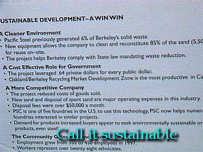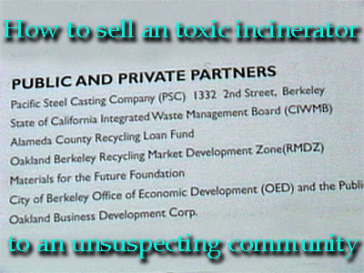 | How to sell an incinerator to Berkeley. This toxic polluter was place in West Berkeley (against Court ordered restrictions) and operated for nearly two decades before Pacific Steel Castings became "ecomomicly" unsustainable. |